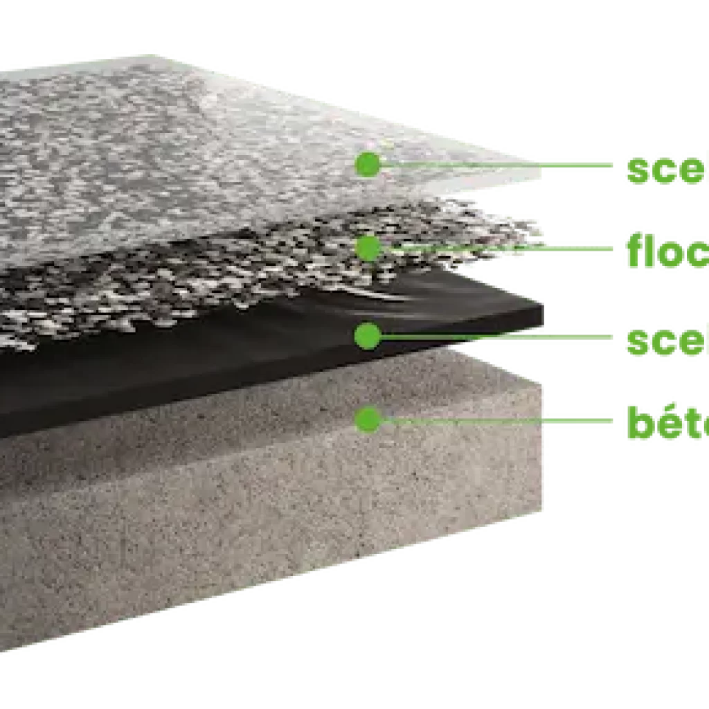 Le plancher de garage est scellé avec un polyuréa de couleur qui sera le lien entre le béton et la couche supérieure. Il existe de nombreuses couleurs de flocons de garage.